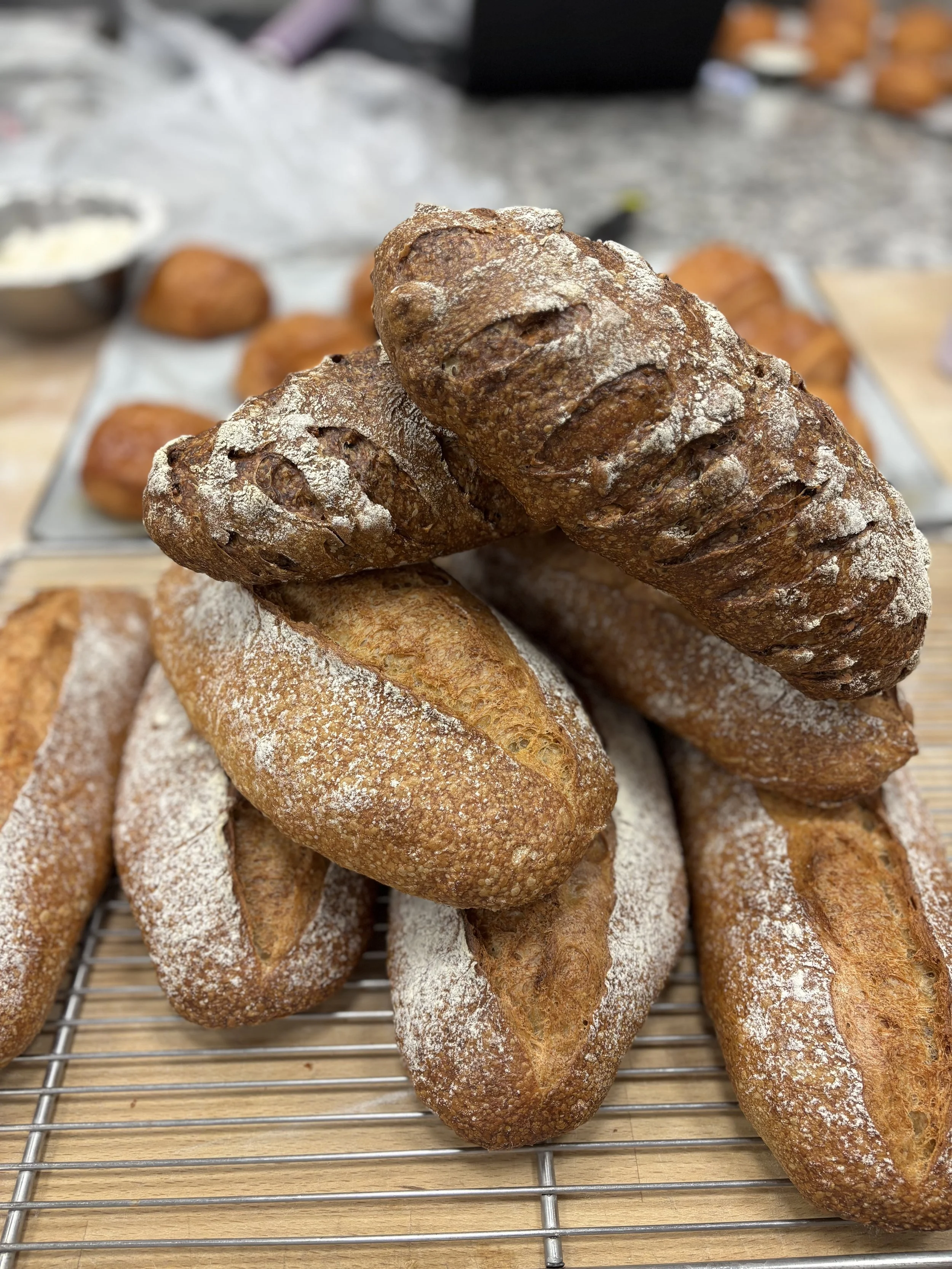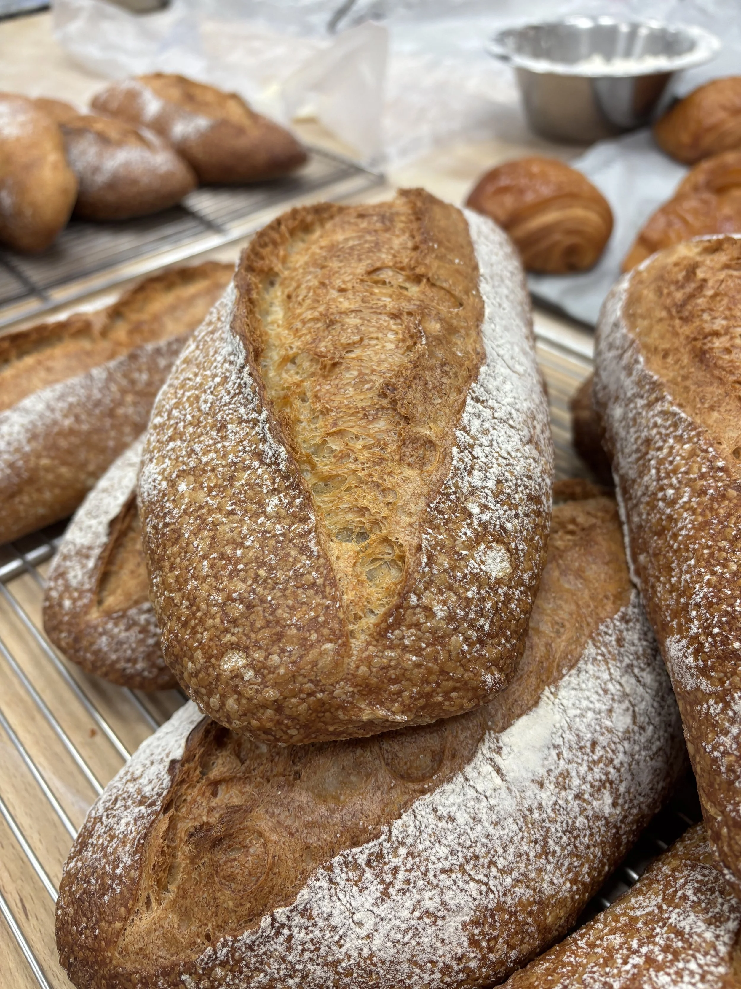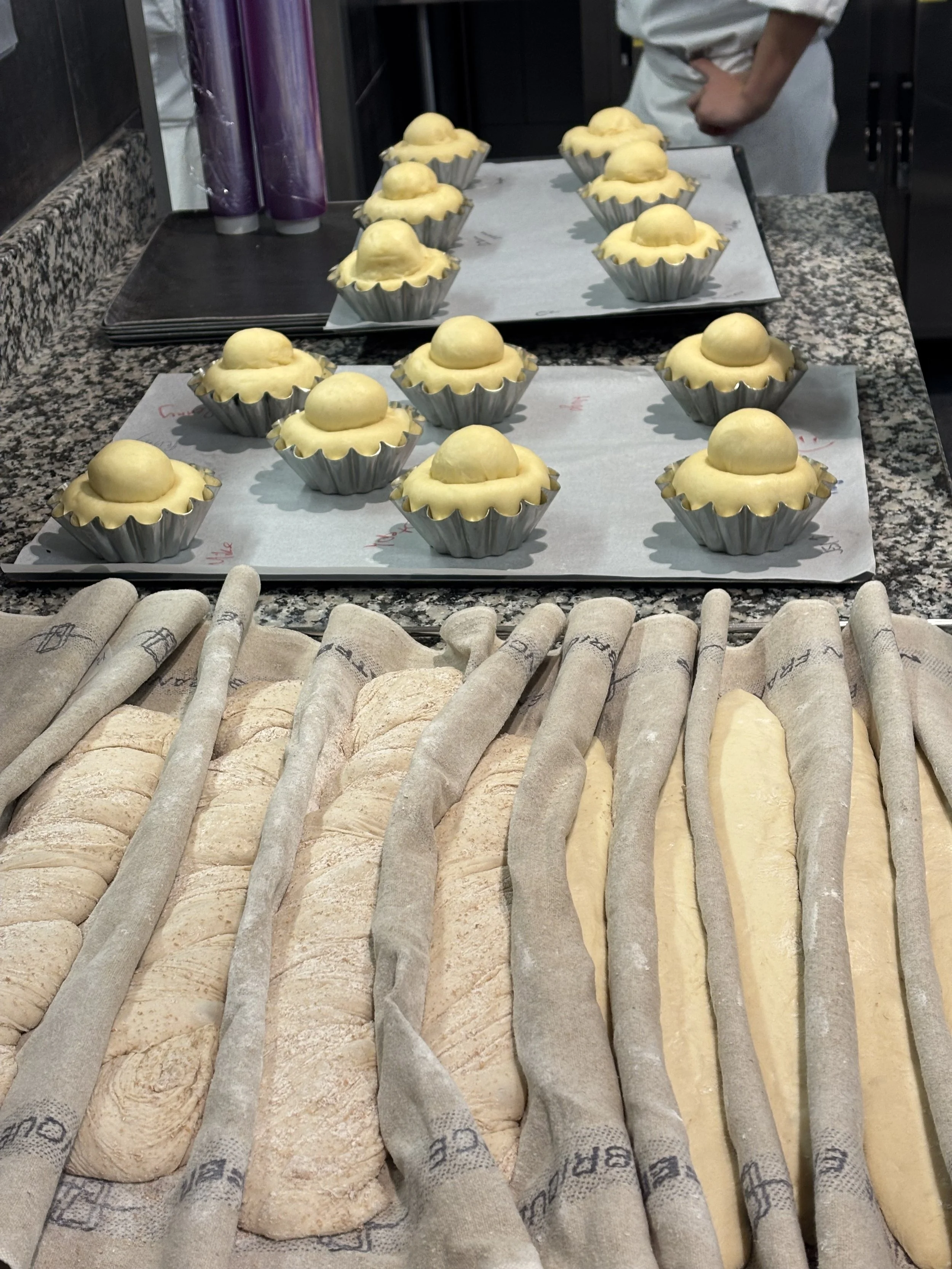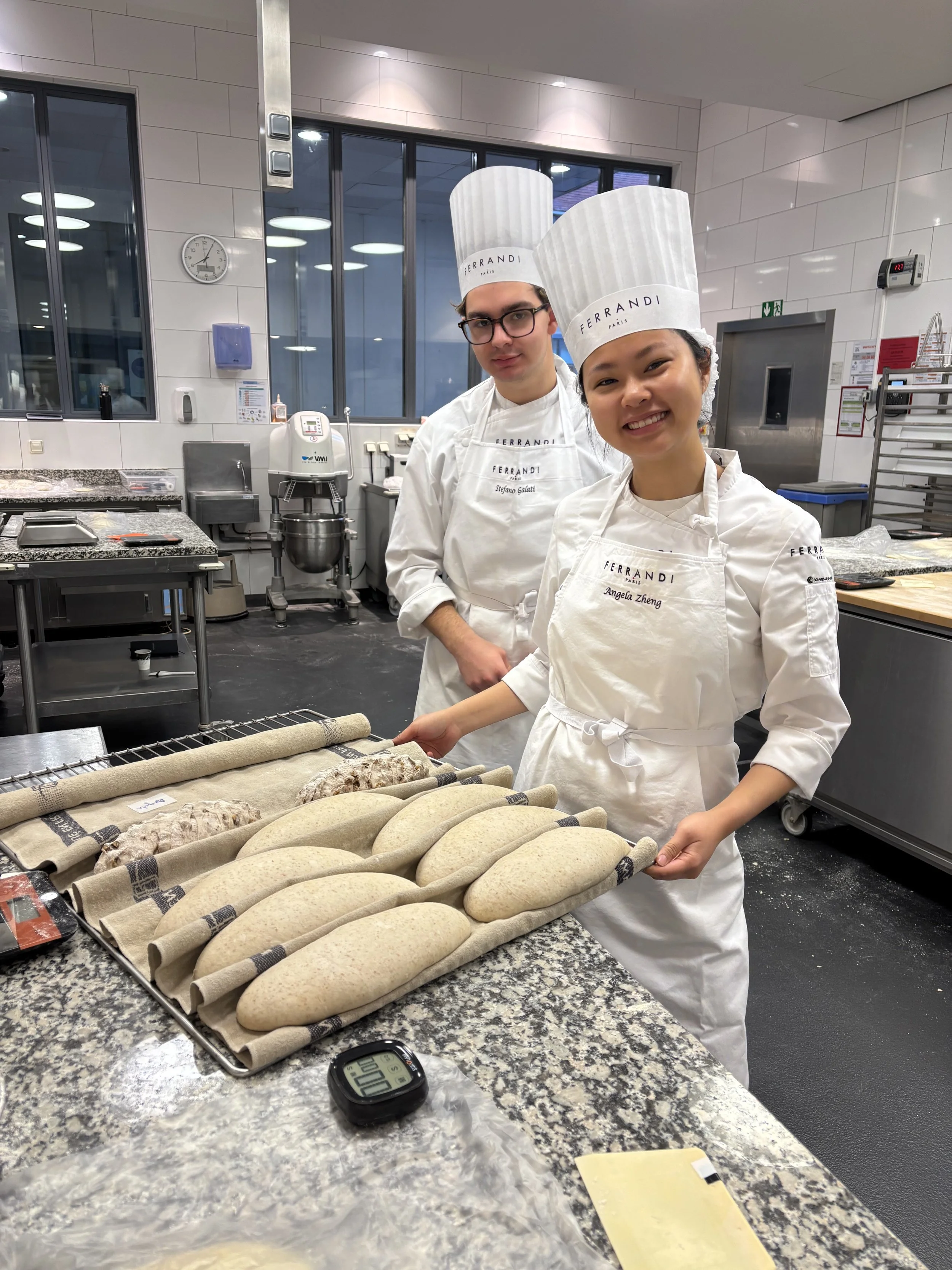 This past week, we had another exam, this time on Pain au Chocolate and Croissants. Feels so whimsical to say such a thing! This exam was my favorite so far, because each of our mistakes provided some distinct change in product outcome. For example, my friend didn’t laminate the butter properly between the dough. Essentially, when you initially but butter in between your croissant dough, you don’t want the dough to overlap at all without butter in between it. It was initially hard to understand why that mattered so much, but this week, someone made their butter too short, and after three days of prep work, the pain au chocolate came out of the oven and you could see smooth spots across the top where there were no butter layers. For my own croissants and pain au chocolate, my dough came out of the dough-sheeter crooked. This means that when I went to cut the squares and triangles that would eventually become my buttery, crunchy products, the dough wasn’t the right size rectangle to get enough cuts out of it. To solve this, I tugged gently at the corners of the dough to stretch it. Well, it turns out that this creates thin spots in your dough. When my pain au chocolate came out of the oven, some were much, much smaller than the others. I weighed them, and some were only 60 grams while the others were 85 grams! Might sound silly, but that’s a huge difference! Imagine if you went to buy a sweet treat, and one was 30% smaller than another and they tried to sell you the little one for the same price. No way, not having it. Anyways, all that to say, we’re getting to a point now, after completing a month of baking (already?!!! Crazy!), where we can begin to truly understand how different steps of the production process impact the final products. When you combine all this experimentation with the classroom sessions we’ve had on things like flour, fermentation, and kneading techniques, the bakery is no longer feeling like this mysterious wonderland, but instead a place where I can look at something and understand what it took to make all those magical, buttery things.