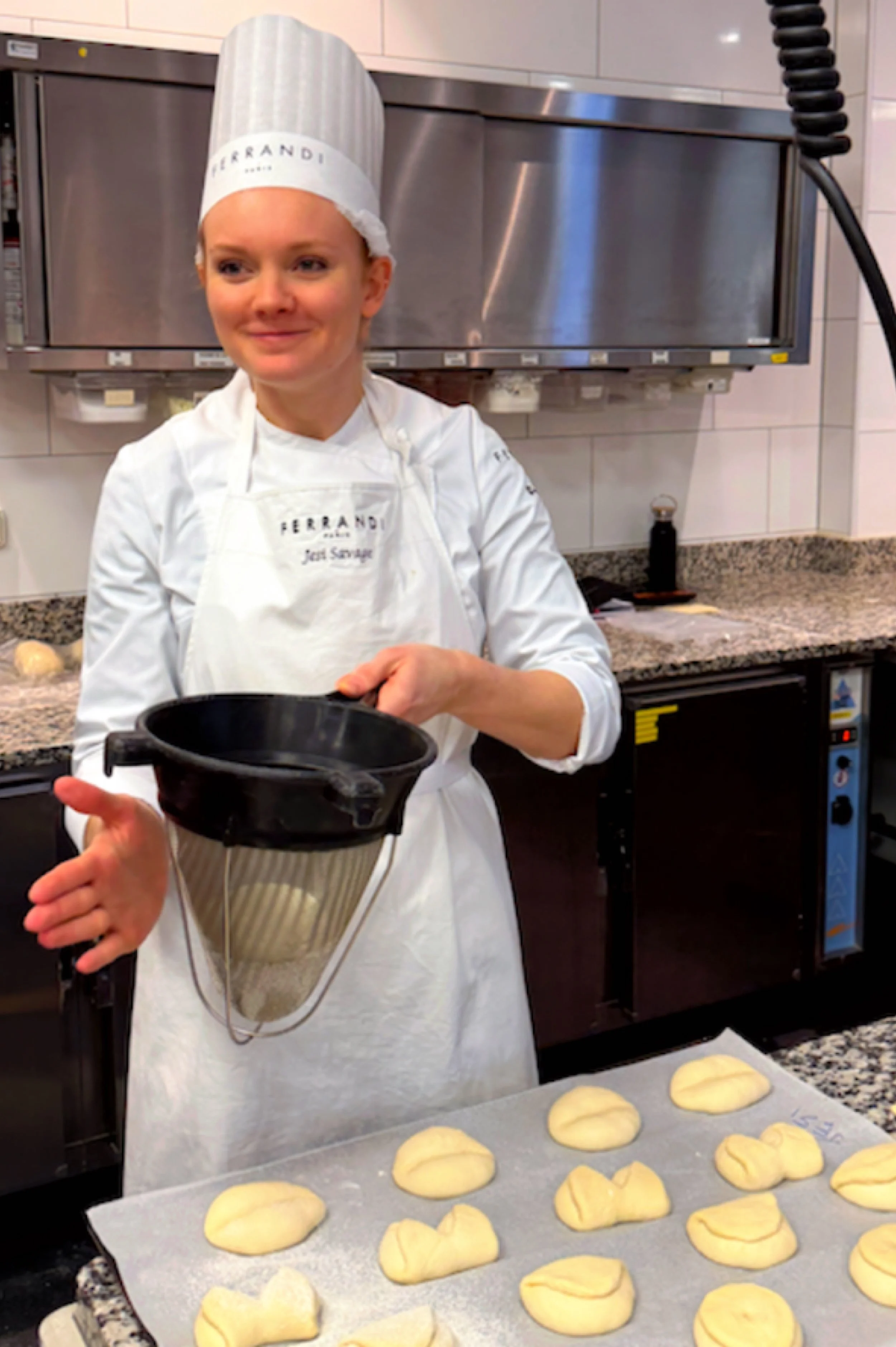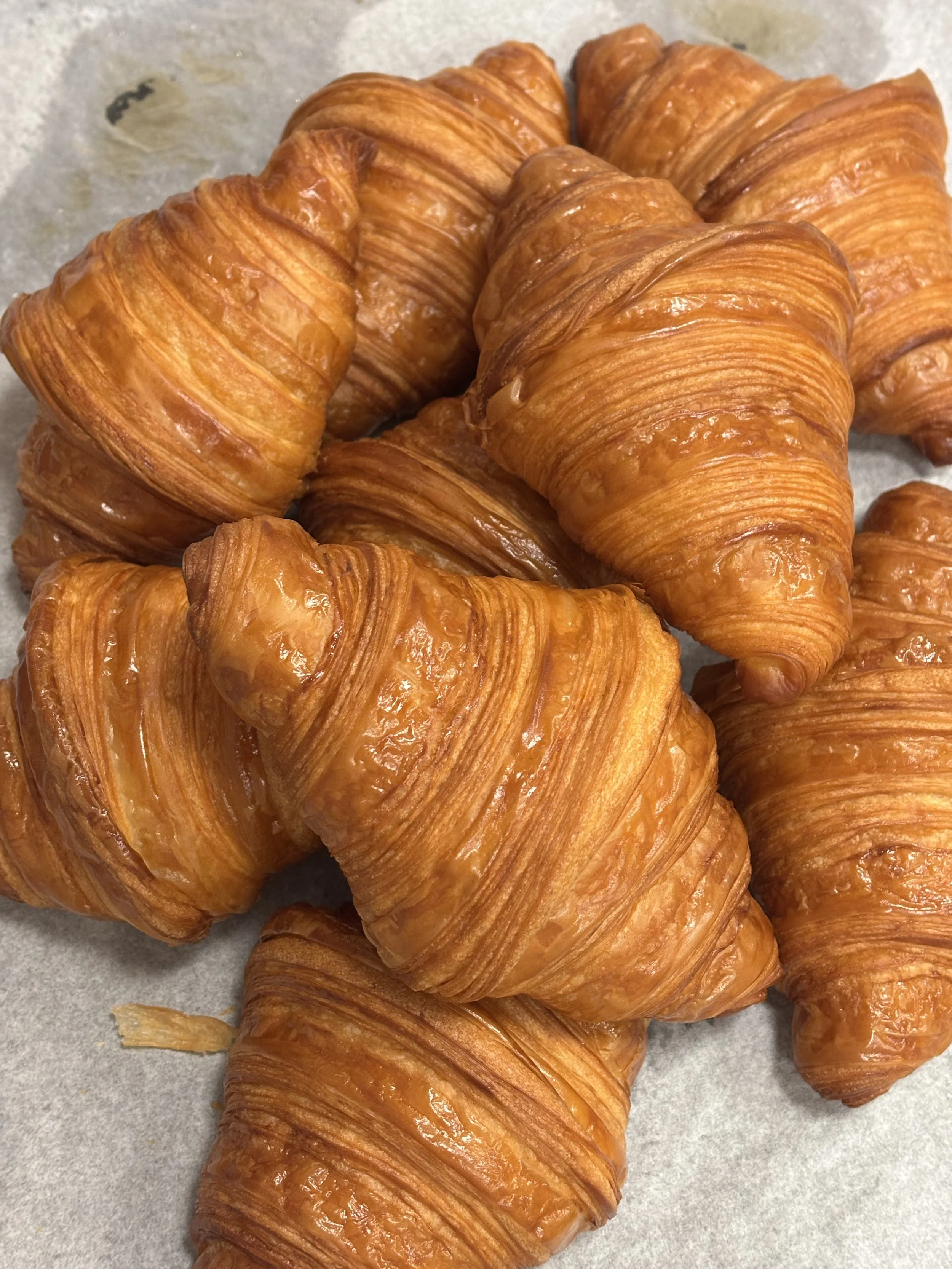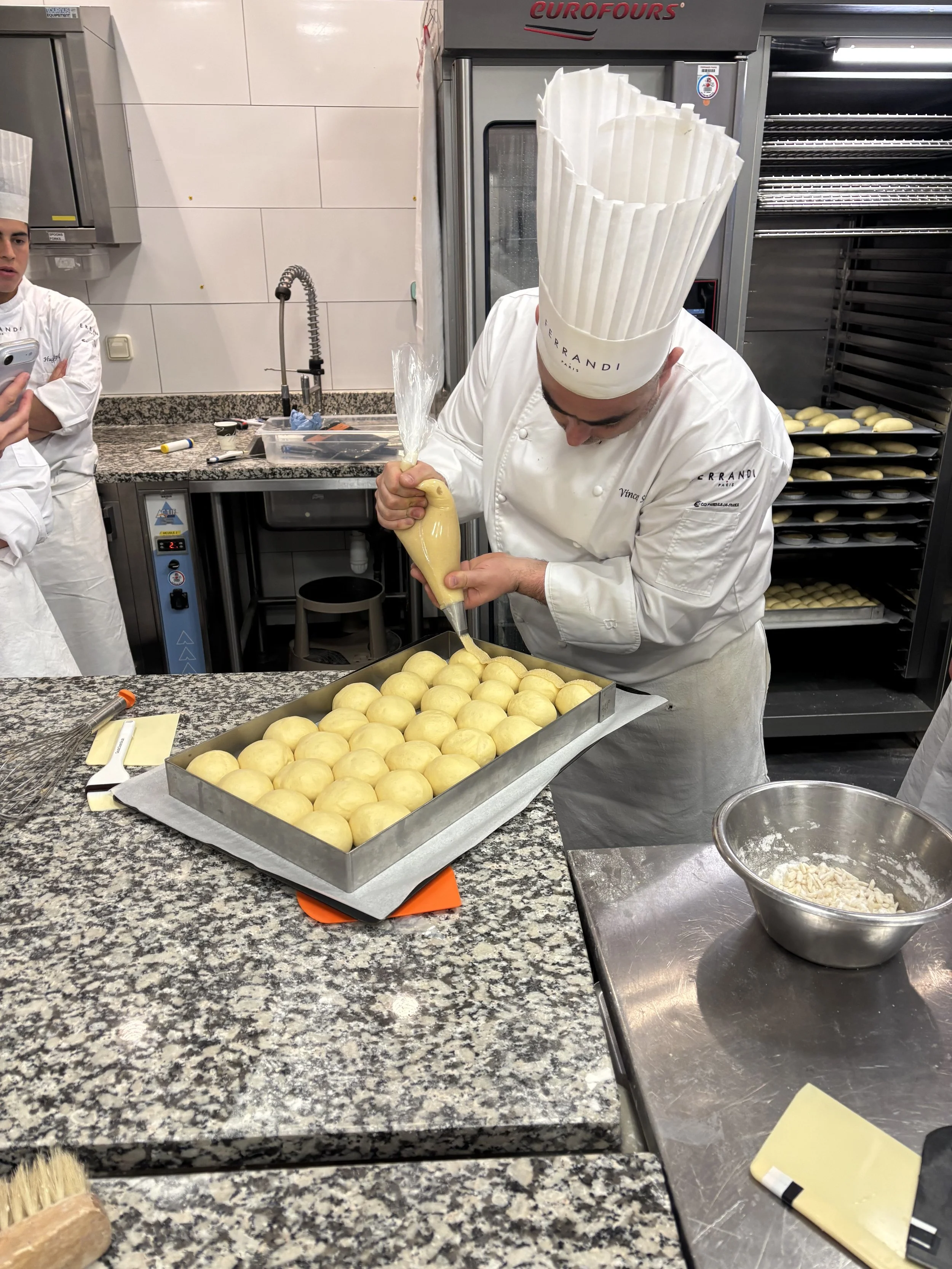 This past week, we had another exam, this time on Pain au Chocolate and Croissants. Feels so whimsical to say such a thing! This exam was my favorite so far, because each of our mistakes provided some distinct change in product outcome. For example, my friend didn’t laminate the butter properly between the dough. Essentially, when you initially but butter in between your croissant dough, you don’t want the dough to overlap at all without butter in between it. It was initially hard to understand why that mattered so much, but this week, someone made their butter too short, and after three days of prep work, the pain au chocolate came out of the oven and you could see smooth spots across the top where there were no butter layers. For my own croissants and pain au chocolate, my dough came out of the dough-sheeter crooked. This means that when I went to cut the squares and triangles that would eventually become my buttery, crunchy products, the dough wasn’t the right size rectangle to get enough cuts out of it. To solve this, I tugged gently at the corners of the dough to stretch it. Well, it turns out that this creates thin spots in your dough. When my pain au chocolate came out of the oven, some were much, much smaller than the others. I weighed them, and some were only 60 grams while the others were 85 grams! Might sound silly, but that’s a huge difference! Imagine if you went to buy a sweet treat, and one was 30% smaller than another and they tried to sell you the little one for the same price. No way, not having it. Anyways, all that to say, we’re getting to a point now, after completing a month of baking (already?!!! Crazy!), where we can begin to truly understand how different steps of the production process impact the final products. When you combine all this experimentation with the classroom sessions we’ve had on things like flour, fermentation, and kneading techniques, the bakery is no longer feeling like this mysterious wonderland, but instead a place where I can look at something and understand what it took to make all those magical, buttery things.