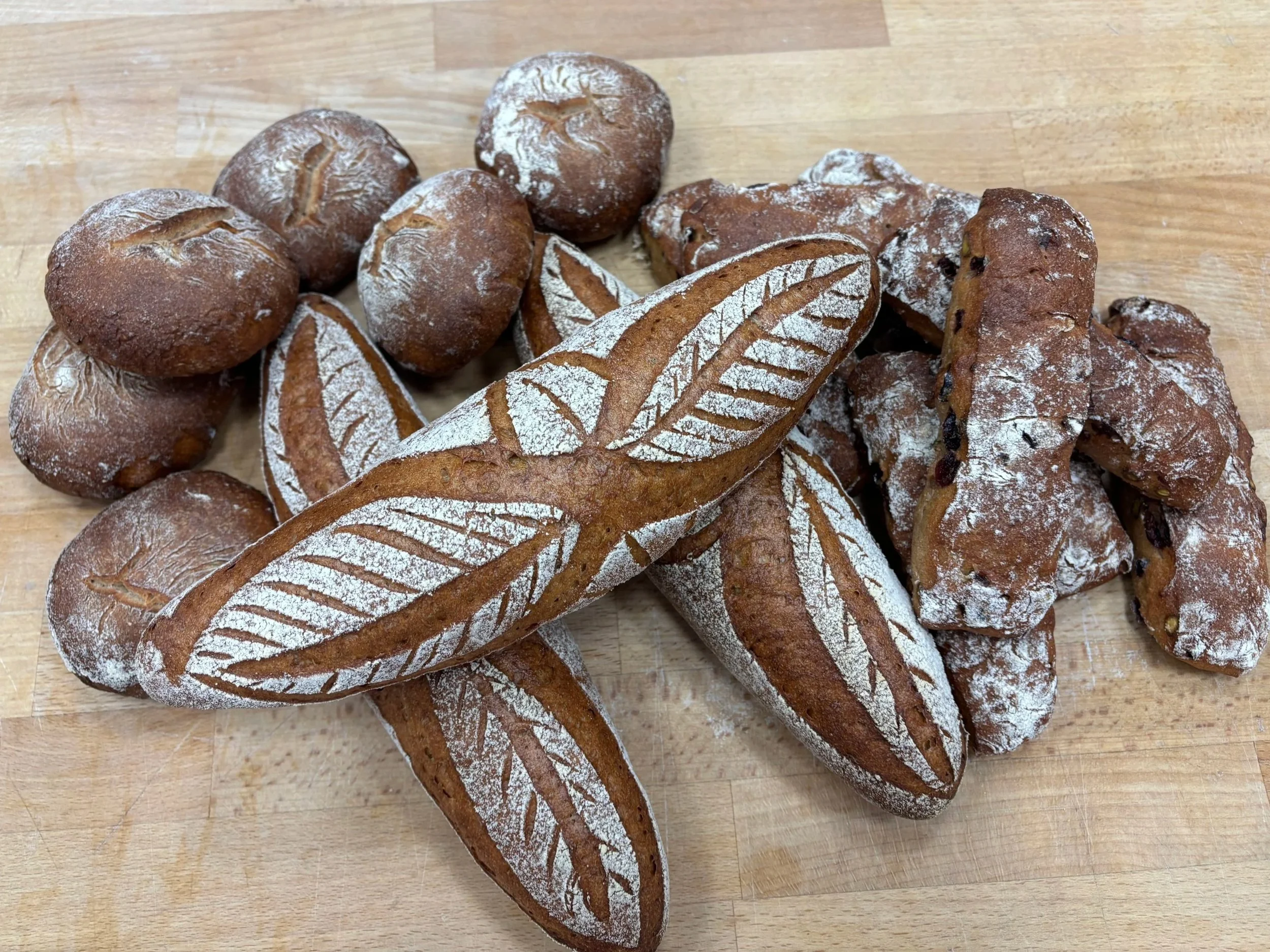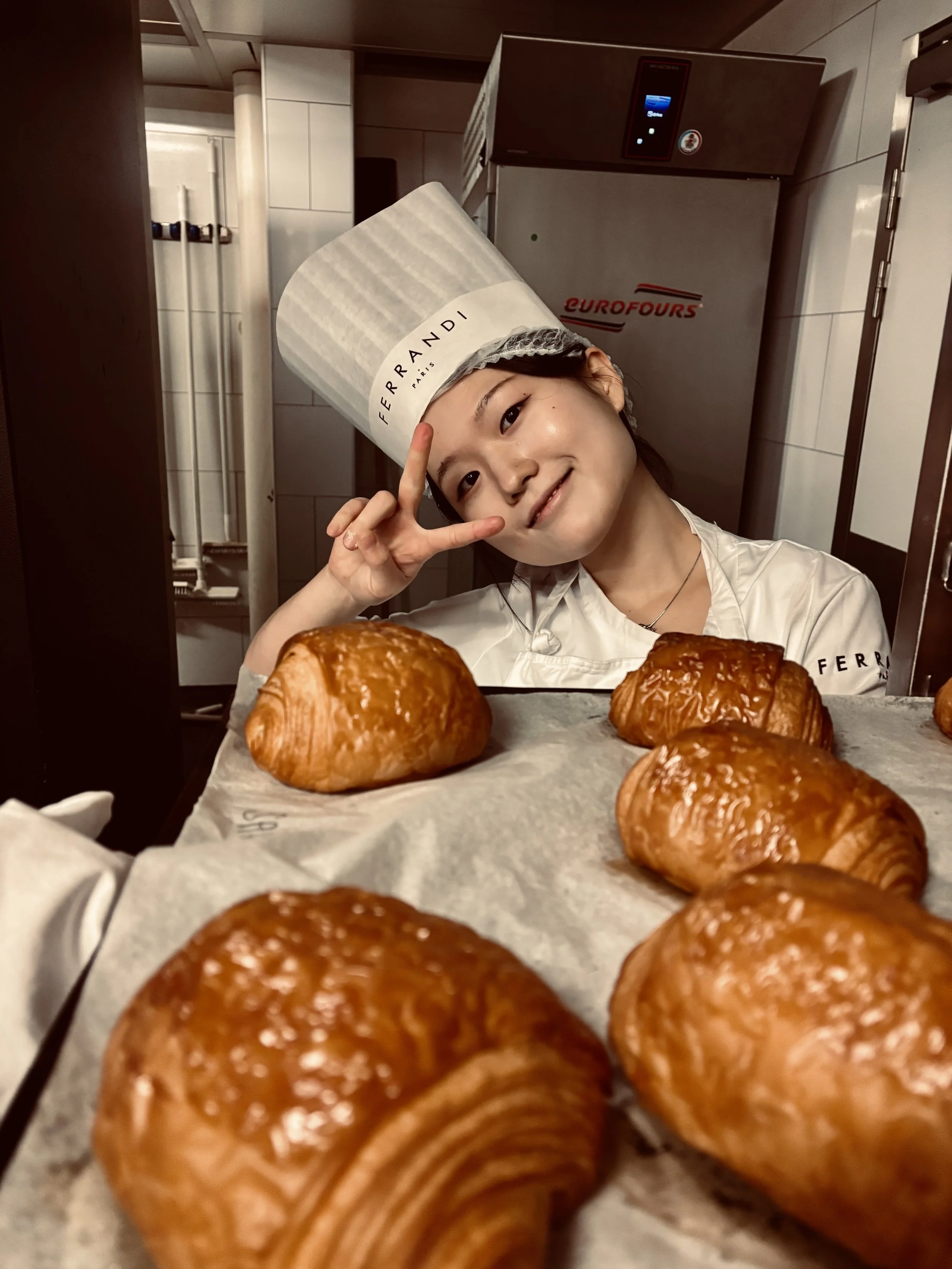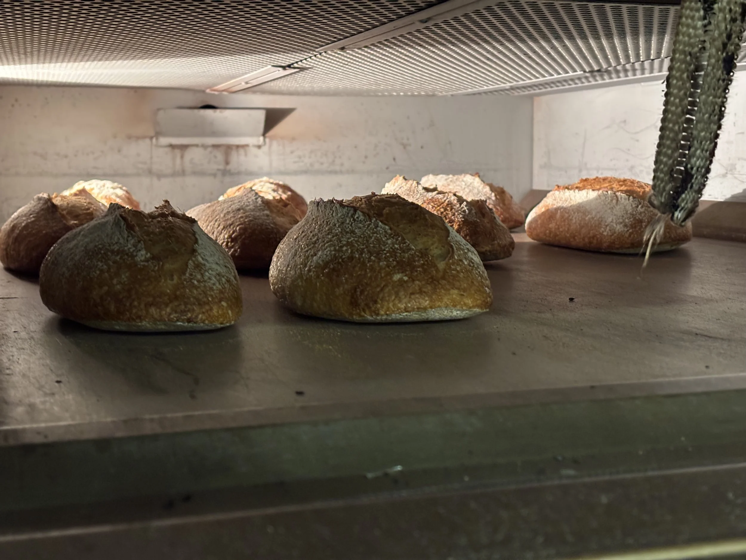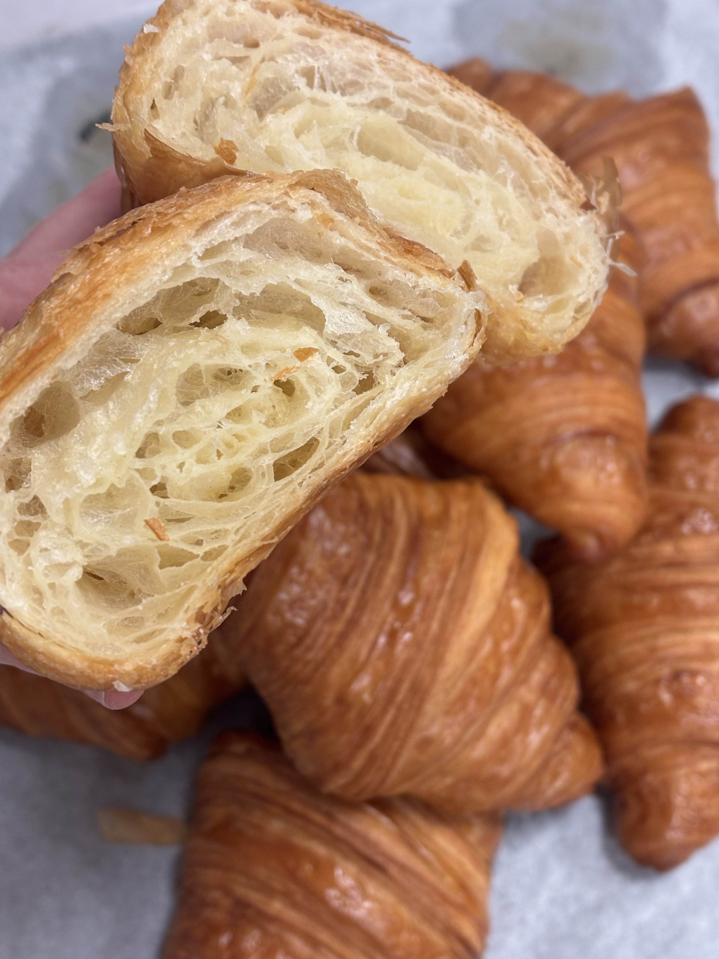 This past week, we had another exam, this time on Pain au Chocolate and Croissants. Feels so whimsical to say such a thing! This exam was my favorite so far, because each of our mistakes provided some distinct change in product outcome. For example, my friend didn’t laminate the butter properly between the dough. Essentially, when you initially but butter in between your croissant dough, you don’t want the dough to overlap at all without butter in between it. It was initially hard to understand why that mattered so much, but this week, someone made their butter too short, and after three days of prep work, the pain au chocolate came out of the oven and you could see smooth spots across the top where there were no butter layers. For my own croissants and pain au chocolate, my dough came out of the dough-sheeter crooked. This means that when I went to cut the squares and triangles that would eventually become my buttery, crunchy products, the dough wasn’t the right size rectangle to get enough cuts out of it. To solve this, I tugged gently at the corners of the dough to stretch it. Well, it turns out that this creates thin spots in your dough. When my pain au chocolate came out of the oven, some were much, much smaller than the others. I weighed them, and some were only 60 grams while the others were 85 grams! Might sound silly, but that’s a huge difference! Imagine if you went to buy a sweet treat, and one was 30% smaller than another and they tried to sell you the little one for the same price. No way, not having it. Anyways, all that to say, we’re getting to a point now, after completing a month of baking (already?!!! Crazy!), where we can begin to truly understand how different steps of the production process impact the final products. When you combine all this experimentation with the classroom sessions we’ve had on things like flour, fermentation, and kneading techniques, the bakery is no longer feeling like this mysterious wonderland, but instead a place where I can look at something and understand what it took to make all those magical, buttery things.
